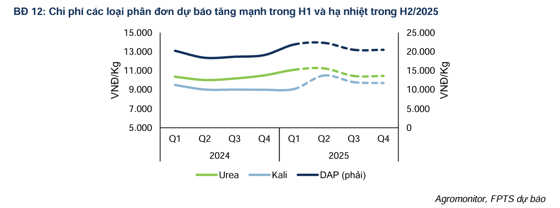 - Áp lực chi phí đầu vào: Chi phí phân đơn đầu vào (Urea, DAP, Kali) ước tính tăng trung bình 9% YoY trong năm 2025 (chủ yếu nửa đầu năm) do nguồn cung thiếu hụt và Trung Quốc hạn chế xuất khẩu. Mức tăng này cao hơn mức tăng giá bán NPK do cạnh tranh gay gắt trong mảng NPK nội địa, hạn chế khả năng chuyển giá.