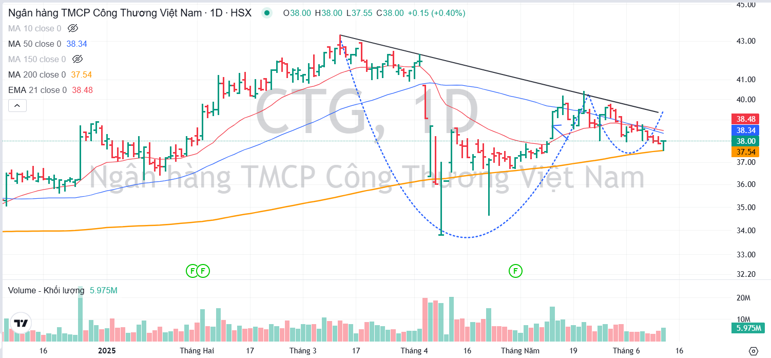 Trên đồ thị, CTG đang kiểm tra lại MA200 ngày. RS của CTG là 55, nằm trong số các cổ phiếu hoạt động trung bình trên thị trường. Khả năng CTG đang xây lại tay cầm. Nhà giao dịch có thể gom khi giá test MA200 ngày