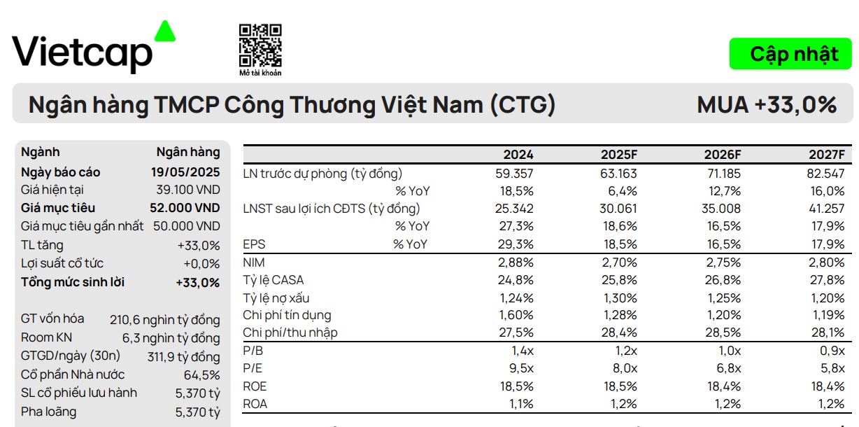 Vietcap (19.5.2025) giữ khuyến nghị MUA đối với CTG và tăng 4.0% giá mục tiêu lên 52,000 đồng/cổ phiếu. Mặc dù nâng giá mục tiêu, Vietcap đã điều chỉnh giảm 2.8% tổng dự báo lợi nhuận cho giai đoạn 2025-2029.