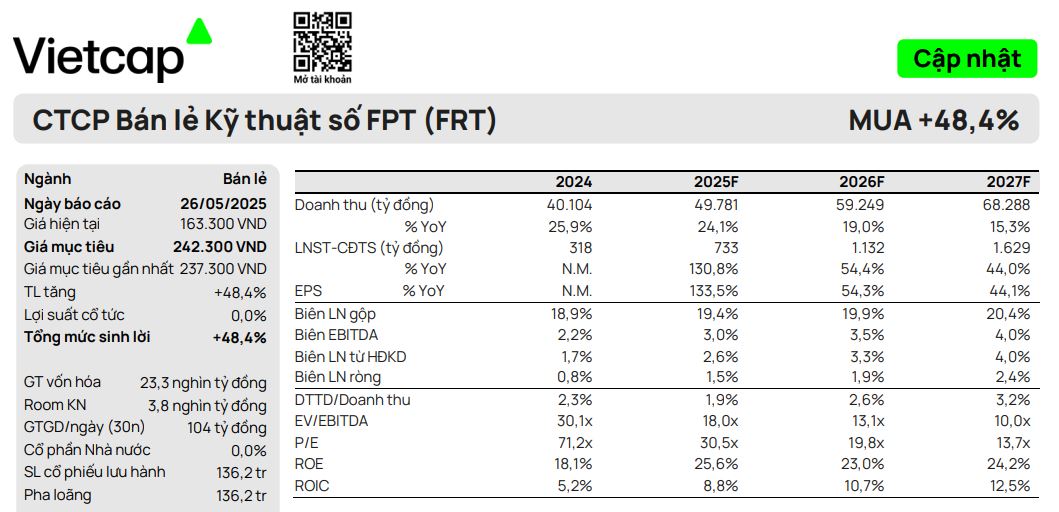Vietcap (27.5.2025) đã tăng giá mục tiêu của FRT thêm 2% lên 242,300 đồng/cổ phiếu và duy trì khuyến nghị MUA. Mức tăng này đến từ việc tăng giá trị đóng góp của Long Châu vào FRT thêm 6%, dựa trên các yếu tố sau: