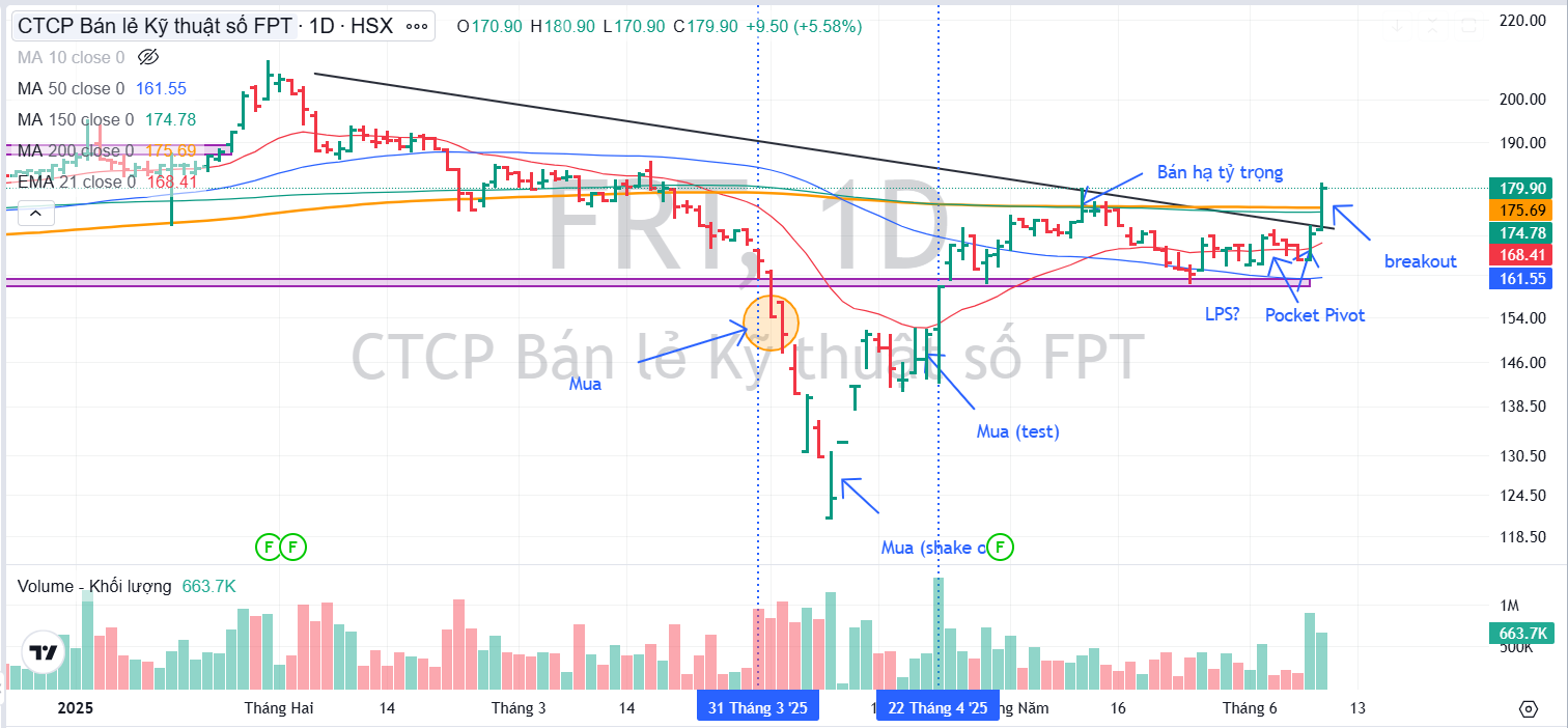 Trên đồ thị, FRT có điểm breakout đường trendline vào ngày 10.6.2025, sau các điểm mua Pocket Pivot trước đó.