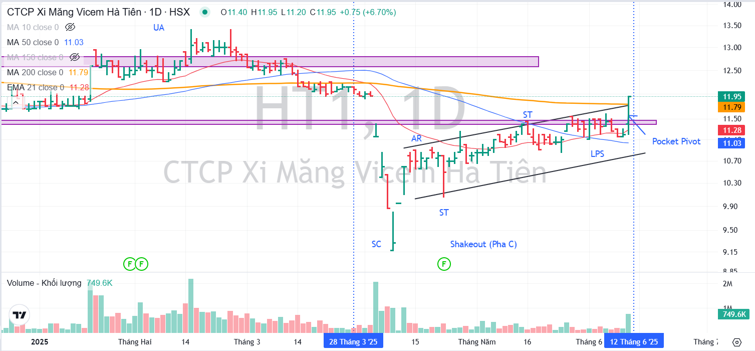 Trên đồ thị, RS của HT1 là 34, nằm trong số các cổ phiếu hoạt động kém trên thị trường. Ngày 11.6.2025, HT1 có điểm mua Pocket Pivot.