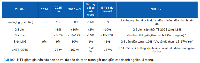 - Điều chỉnh triển vọng sản lượng: BSC giữ nguyên quan điểm sản lượng tiêu thụ phục hồi trong cả năm 2025 nhờ thị trường BĐS ấm lên và các công trình đầu tư công được đẩy mạnh. Tuy nhiên, do số liệu Quý 1 thấp hơn kỳ vọng, BSC điều chỉnh kỳ vọng HT1 sẽ duy trì mức sản lượng 1.4-1.6 triệu tấn/quý (giảm 15% so với dự báo trước đó). Theo đó, BSC kỳ vọng sản lượng tiêu thụ đạt 6 triệu tấn (+10% YoY) trong năm 2025.