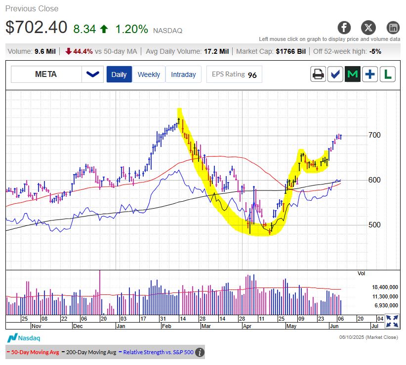Cổ phiếu của Meta Platforms ( META ) đã phục hồi sau ba tháng sụt giảm. Triển vọng cải thiện về thuế quan và kết quả kinh doanh quý đầu tiên mạnh hơn dự kiến từ công ty mẹ Facebook hiện đã đưa cổ phiếu Meta lên mức cao kỷ lục từ đầu năm nay.