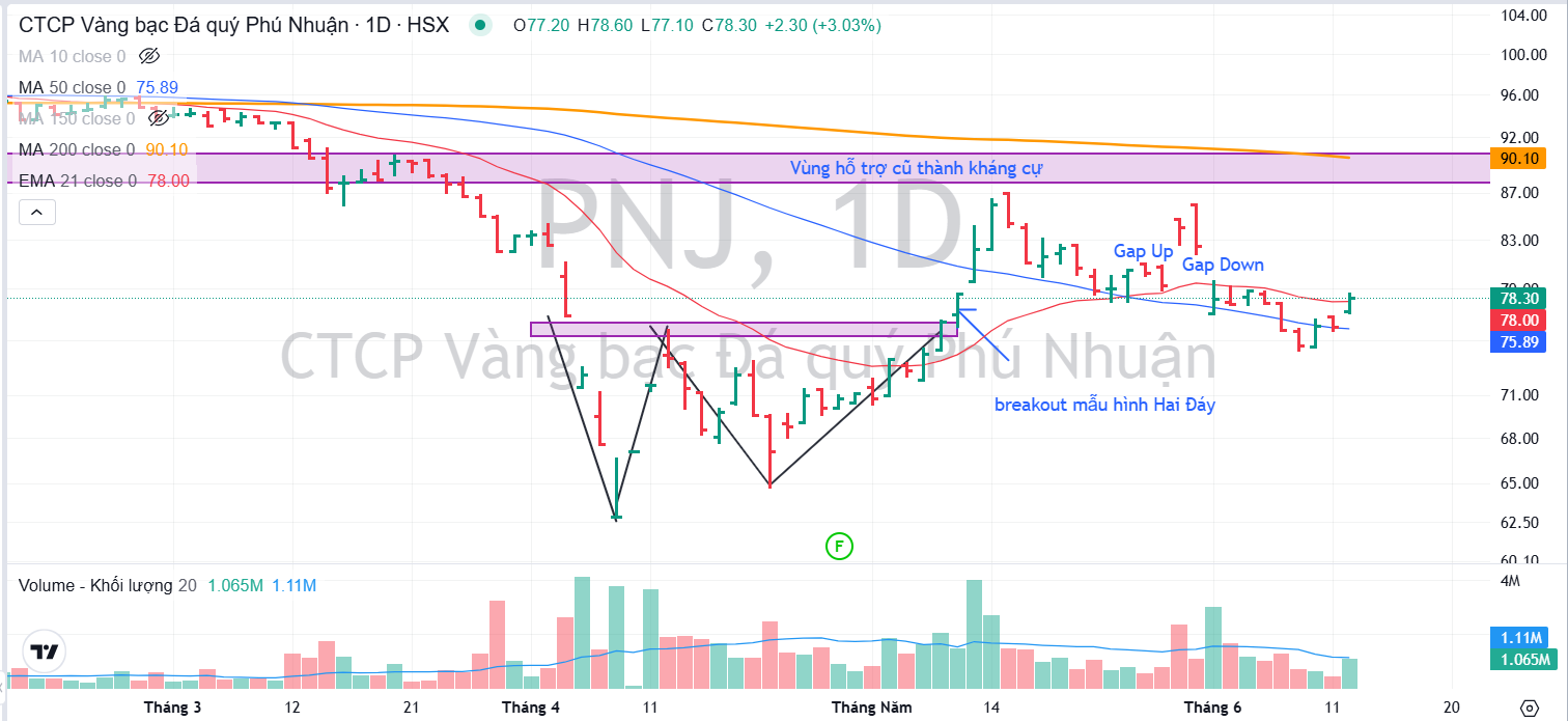 Trên đồ thị, PNJ đang có gắng tích luỹ quanh MA50 ngày và sẽ cần thêm thời gian để xây nền giá.