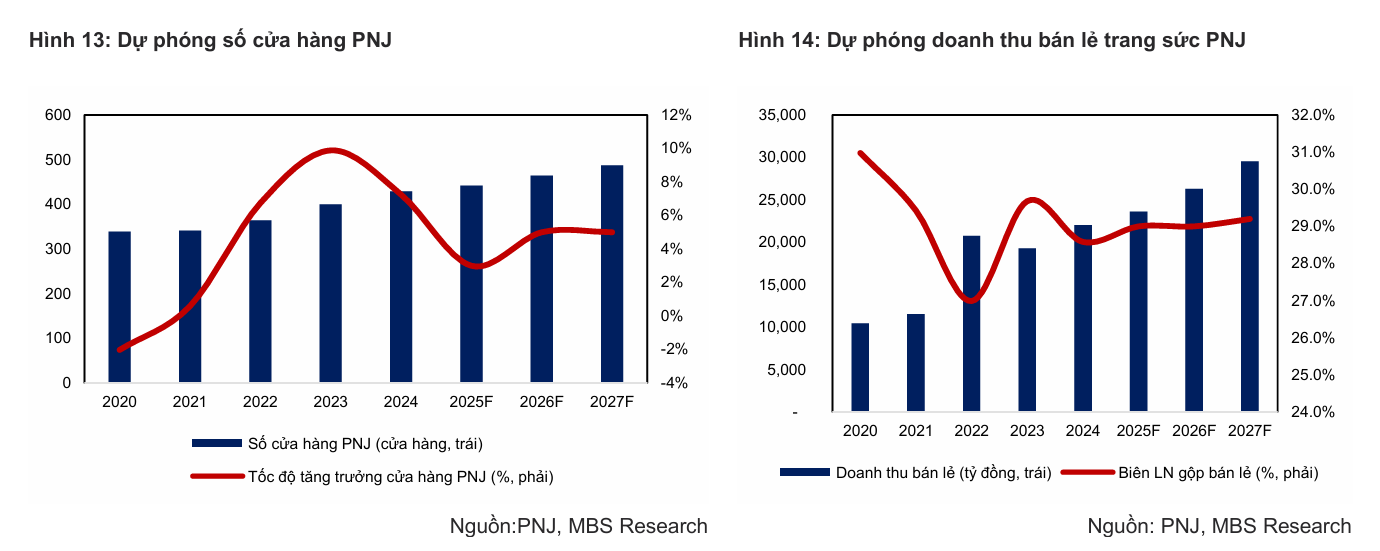 Trong dài hạn, PNJ vẫn là thương hiệu nữ trang nội địa đứng đầu ngành với hơn 429 cửa hàng và năng lực sản xuất lớn. Với sự gia tăng của tầng lớp trung lưu và xu hướng chuyển dịch từ mua hàng không thương hiệu sang các thương hiệu uy tín, PNJ được kỳ vọng sẽ tiếp tục là doanh nghiệp hưởng lợi hàng đầu. MBS dự báo mảng bán lẻ sẽ tiếp tục dẫn dắt PNJ với tốc độ tăng trưởng lợi nhuận kép 16% CAGR trong giai đoạn 2025-2030.