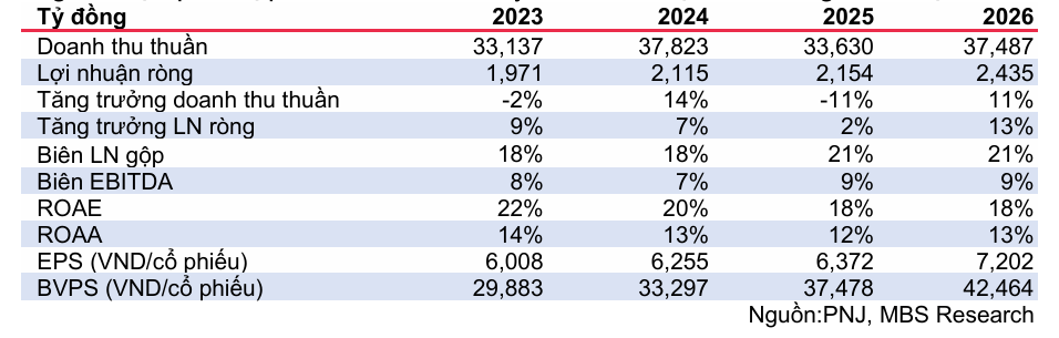 Các công ty chứng khoán đã điều chỉnh dự báo lợi nhuận PNJ cho năm 2025-2026. Một báo cáo của MBS (có thể tham khảo quan điểm tương tự từ các CTCK khác như HSC) hạ dự báo lợi nhuận ròng 2025-2026 lần lượt 14% và 15% so với báo cáo trước, do nguồn cung vàng miếng thiếu hụt và nhu cầu trang sức dự kiến đi ngang. Sau điều chỉnh, lợi nhuận ròng 2025-2026 dự báo tăng 2% và 13% so với cùng kỳ.