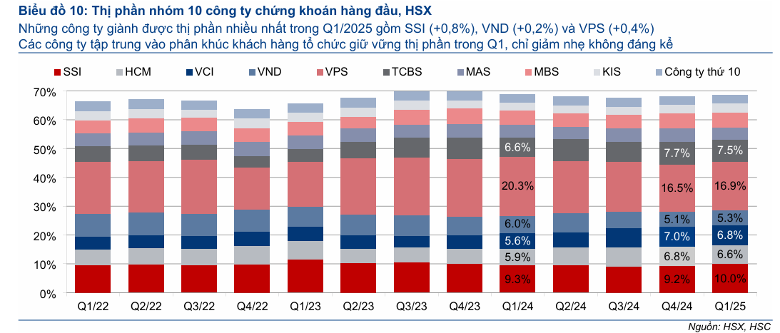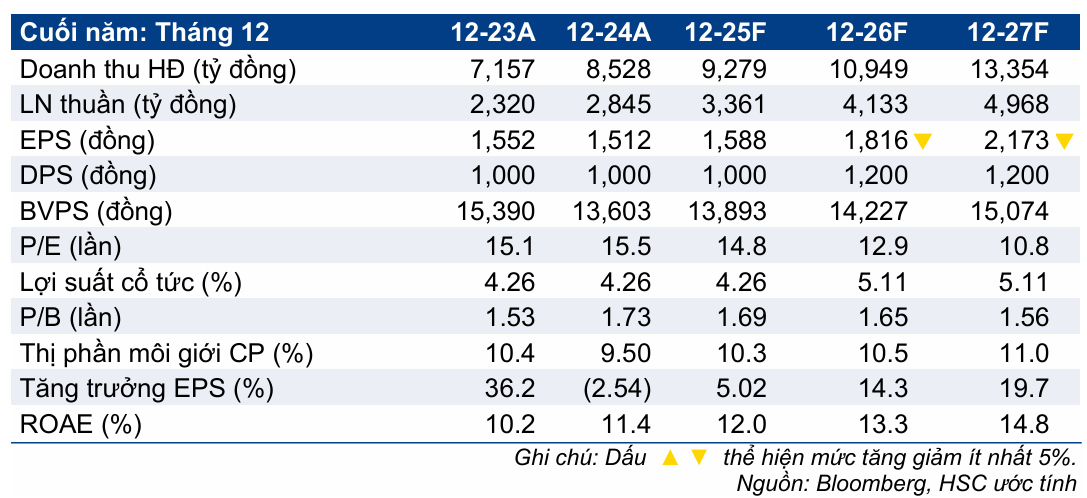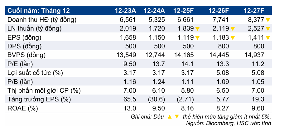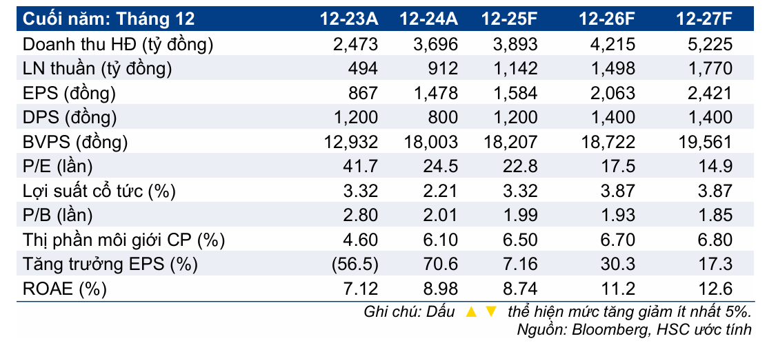 - Dự báo lợi nhuận: HSC giữ nguyên dự báo lợi nhuận thuần SSI tăng trưởng lần lượt 18%, 23% và 20% trong giai đoạn 2025-2027, nhờ mảng cho vay ký quỹ mạnh mẽ và lãi hoạt động tự doanh vững chắc.