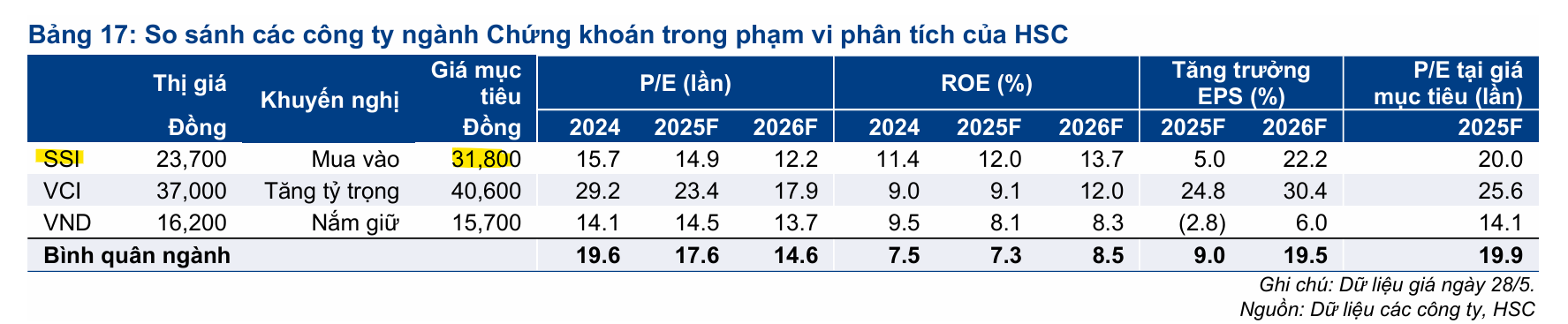 - Luận điểm: SSI vẫn là lựa chọn hàng đầu của HSC nhờ vị thế dẫn đầu thị trường, triển vọng lợi nhuận mạnh mẽ, quy mô lớn và lợi suất cổ tức hấp dẫn (ước tính 4.2%).
