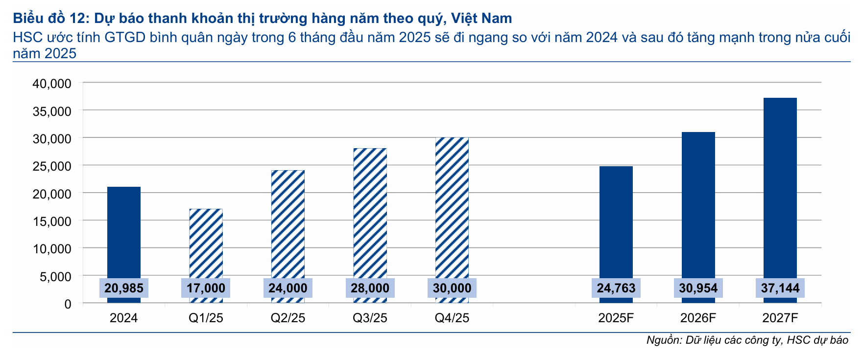 HSC kỳ vọng giá trị giao dịch bình quân ngày sẽ tiếp tục tăng trong nửa cuối năm 2025 nhờ nền tảng kinh tế vĩ mô cải thiện và triển vọng nâng hạng thị trường. Dòng tiền trong nước được dự báo sẽ mạnh lên khi các kênh đầu tư thay thế trở nên kém hấp dẫn hơn.
