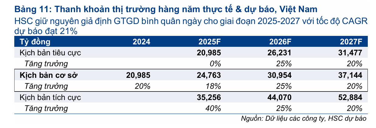 Với thanh khoản 5 tháng đầu năm sát với dự báo, HSC giữ nguyên dự báo giá trị giao dịch bình quân ngày năm 2025 đạt 24,700 tỷ đồng (+18% YoY). Trong các năm 2026-2027, con số này dự kiến tiếp tục tăng lên 30,900 tỷ đồng (+25%) và 37,100 tỷ đồng (+20%). Ngành chứng khoán nói chung dự báo đạt tốc độ tăng trưởng CAGR lợi nhuận thuần 3 năm là 19.3%.
