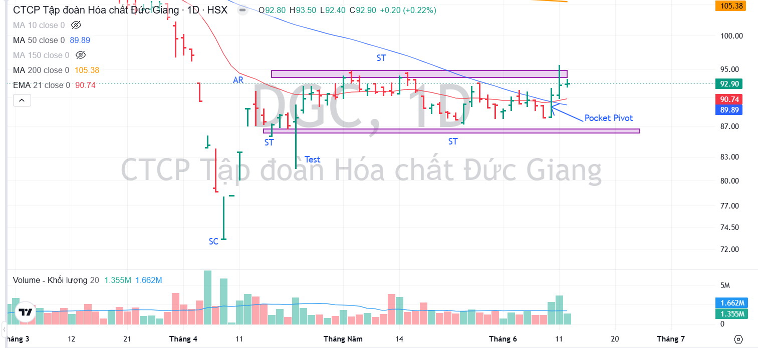 Trên đồ thị, RS của DGC là 12, nằm trong số các cổ phiếu hoạt động kém trên thị trường. Ngày 10.6.2025, DGC có điểm mua Pocket Pivot trong khu vực tích luỹ. Khả năng DGC cần thêm thời gian tích luỹ.