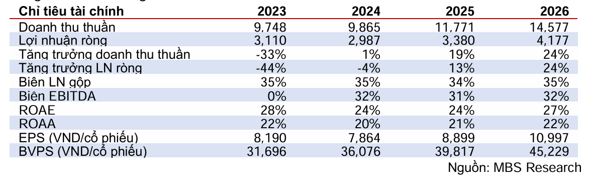 - Triển vọng tăng trưởng 2025-2026: MBS kỳ vọng lợi nhuận ròng của DGC sẽ cải thiện 13.2% và 23.6% YoY trong năm 2025 và 2026. Mặc dù có điều chỉnh giảm nhẹ dự báo doanh thu IPC và Photphat nông nghiệp do giá P4 phục hồi chậm hơn và nhu cầu WPA giảm tại Ấn Độ, nhưng lợi nhuận vẫn được hỗ trợ bởi: