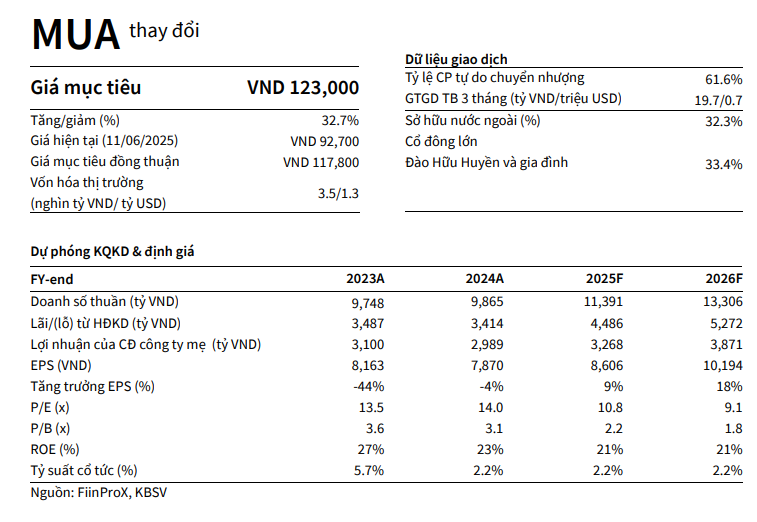KBSV (12.6.2025) đặt niềm tin mạnh mẽ vào DGC với khuyến nghị MUA và giá mục tiêu cao nhất trong ba công ty, đạt 123,000 VND/cổ phiếu. Luận điểm của KBSV tập trung vào nhu cầu thị trường hồi phục và các dự án lớn.