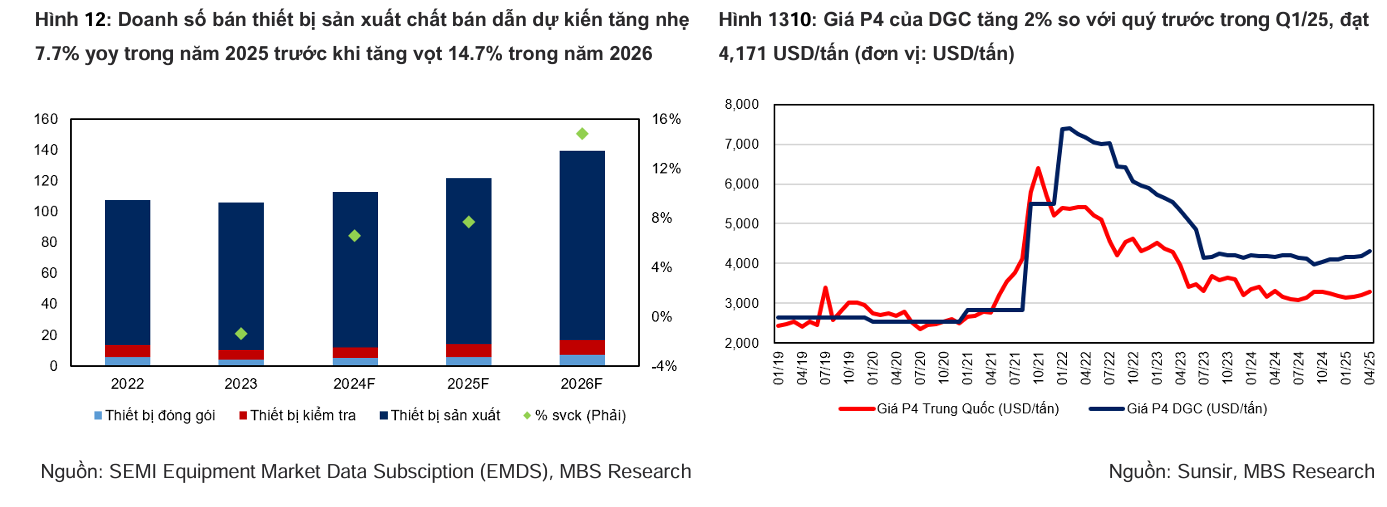 - Giá P4 phục hồi: Kỳ vọng giá P4 sẽ tiếp tục phục hồi từ Q4/2025 nhờ doanh số bán thiết bị bán dẫn tăng, Trung Quốc duy trì hạn chế xuất khẩu P4 và DGC tập trung xuất khẩu sang các thị trường giá cao hơn.