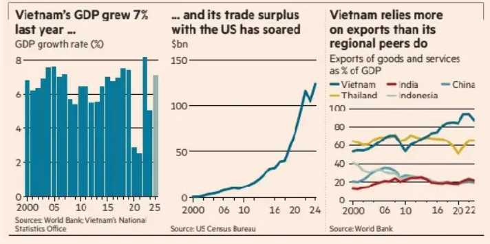 Thành công kinh tế gần đây của đất nước – với mức tăng trưởng GDP là 7% vào năm ngoái – chủ yếu được thúc đẩy bởi xuất khẩu sang Hoa Kỳ và đầu tư tăng vọt từ các công ty đang tháo chạy khỏi Trung Quốc. Đầu tư trực tiếp nước ngoài vào Việt Nam đã tăng từ 15.8 tỷ đô la vào năm 2016 lên 38.2 tỷ đô la vào năm 2024 và đã trở thành một mắt xích quan trọng trong chuỗi cung ứng toàn cầu, là nơi đặt trụ sở của các công ty sản xuất lớn như Apple, Intel, Samsung và Nike.