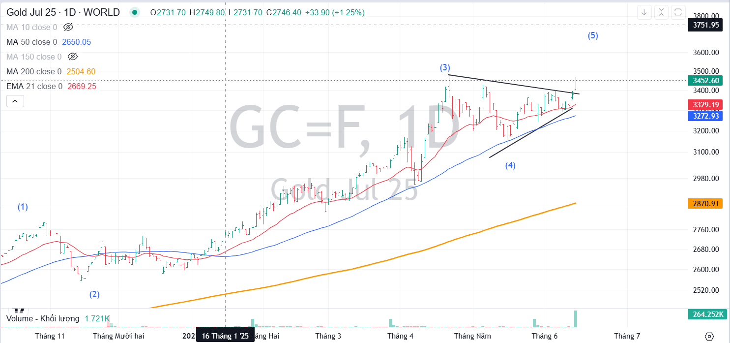 Bình luận của admin dưới góc nhìn sóng Elliott. Vàng hoàn tất sóng giảm (4) và hiện đang đi vào sóng tăng (5) Mục tiêu giá 3,500 và 3,700