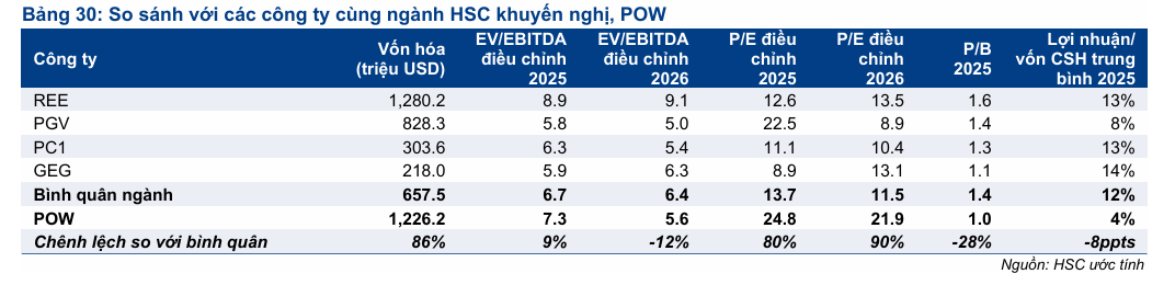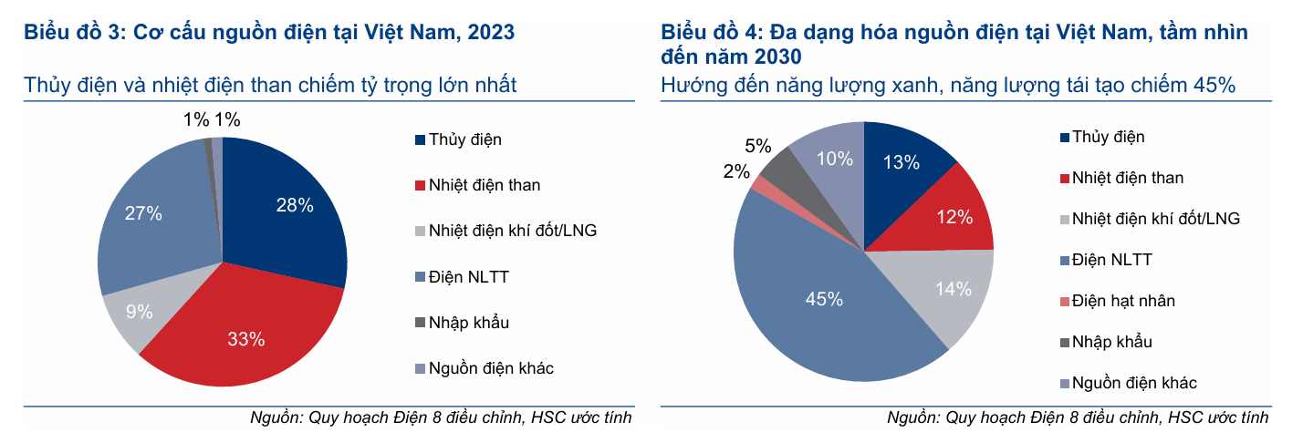- PGV: Định hướng chuyển dịch sang năng lượng xanh với kế hoạch LNG dài hạn, điện gió ngoài khơi, thủy điện và điện linh hoạt, dù các dự án này mang tính dài hạn. HSC duy trì dự báo lợi nhuận cho PGV nhờ sản lượng huy động mạnh mẽ từ các nhà máy nhiệt điện khí và than.