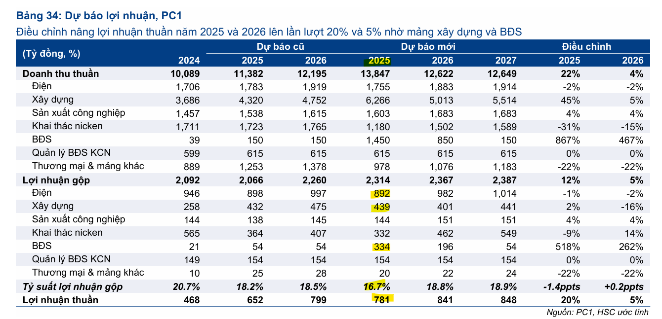Điều chỉnh tăng dự báo lợi nhuận năm 2025: HSC tăng 20% dự báo lợi nhuận thuần năm 2025 cho PC1. Sự điều chỉnh này chủ yếu nhờ vào: