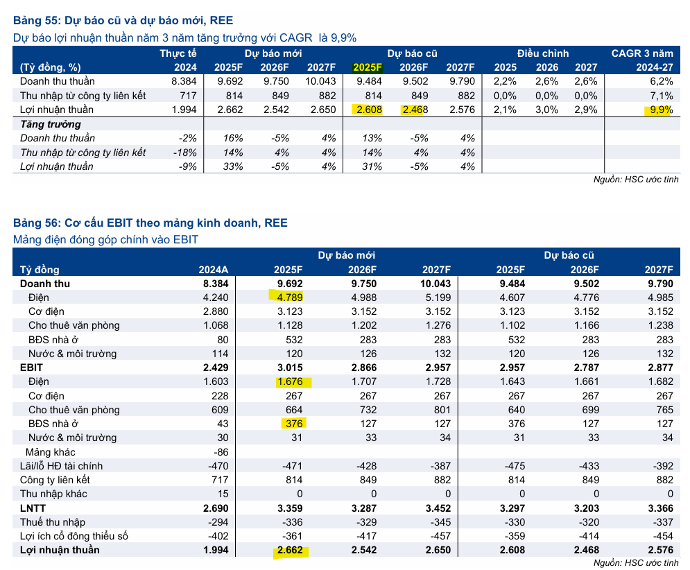 - REE: Tiếp tục mở rộng danh mục năng lượng tái tạo với các dự án thủy điện (Trà Khúc 2, Thác Bà 2) và điện gió (Duyên Hải), đồng thời đang đề xuất thêm các dự án điện gió quy mô lớn. HSC tăng nhẹ 2,1% và 3% dự báo lợi nhuận thuần cho năm 2025 và 2026 cho REE, phản ánh tỷ giá USD/VND cao hơn và việc bổ sung Thác Bà 2.