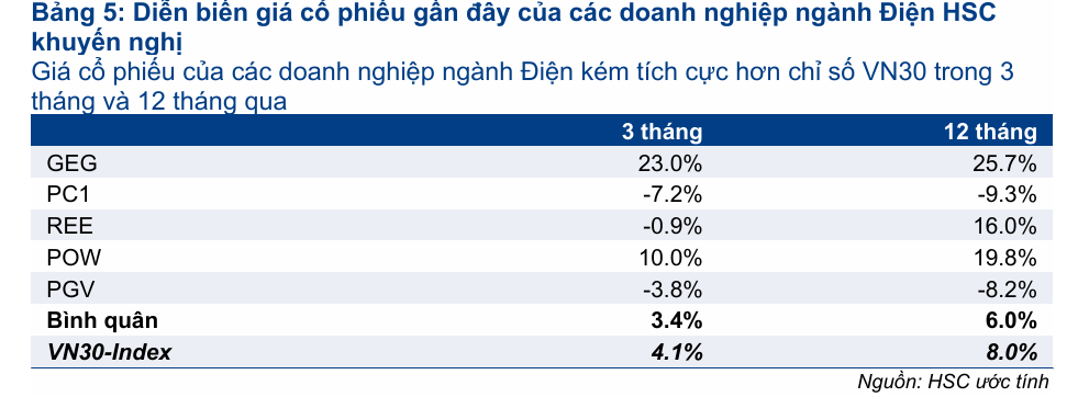 Trong 3 tháng qua, cổ phiếu ngành điện trong danh sách khuyến nghị của HSC ghi nhận mức sinh lời bình quân 3.4%, thấp hơn nhẹ so với VN-Index (4,1%), nhưng có sự phân hóa. GEG và POW có diễn biến vượt trội, phản ánh sự phù hợp cao với xu hướng chuyển dịch năng lượng xanh.