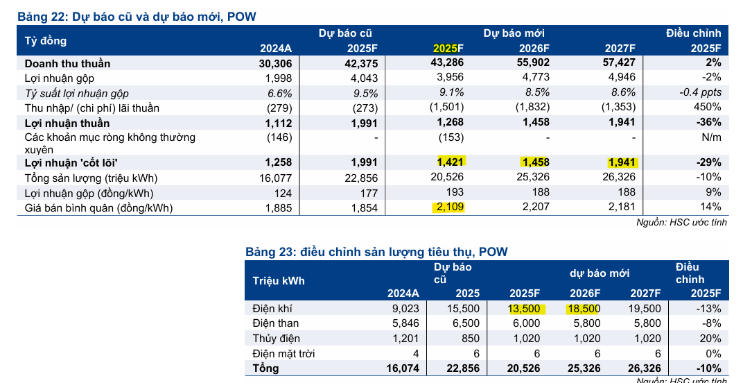- POW: Dự kiến có chuyển biến tích cực khi hai nhà máy điện khí LNG Nhơn Trạch 3 và 4 đi vào vận hành thương mại vào cuối năm 2025 (dù tiến độ chậm hơn dự kiến ban đầu). HSC giảm 36% dự báo lợi nhuận thuần năm 2025 của POW do đóng góp thấp hơn từ NT3&4 trong giai đoạn đầu vận hành và chi phí lãi vay tăng. Tuy nhiên, kỳ vọng phục hồi mạnh mẽ từ 2026-2027 khi hai nhà máy này vận hành toàn phần. POW cũng đang mở rộng sang các ứng dụng năng lượng sạch (trạm sạc xe điện).