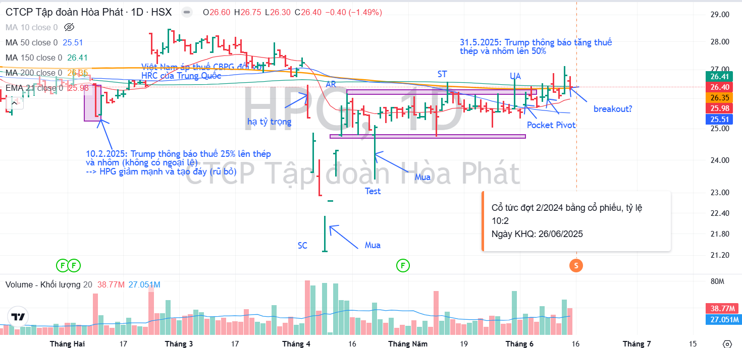 Trên đồ thị, RS của HPG là 63, hoạt động ở mức trung bình trên thị trường. Ngày 12.6.2025, HPG có điểm breakout mẫu hình Chiếc Cốc Tay Cầm. Lưu ý ngày 26.6.2025 là ngày GD KHQ chi trả cổ tức cổ phiếu tỷ lệ 20%. Một số nhà đầu tư không thích bị kẹt cổ phiếu thường có khuynh hướng chọn mua sau ngày KHQ.