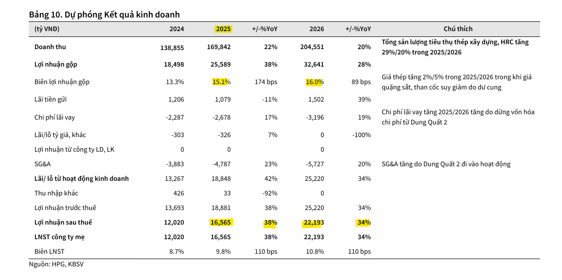 KBSV nhận định HPG ghi nhận tăng trưởng tích cực trong Quý 1/2025 và dự báo nhu cầu tiêu thụ sẽ tiếp tục gia tăng nhờ các yếu tố vĩ mô thuận lợi. KBSV (13.6.2025) khuyến nghị MUA với giá mục tiêu 36,500 VND/cổ phiếu, dựa trên kỳ vọng LNST 2025 tăng trưởng 38% yoy, lên mức 16,565 tỷ đồng. Nhìn về năm 2026, LNST của HPG dự kiến tiếp tục tăng 34% lên mức 22,193 tỷ đồng.