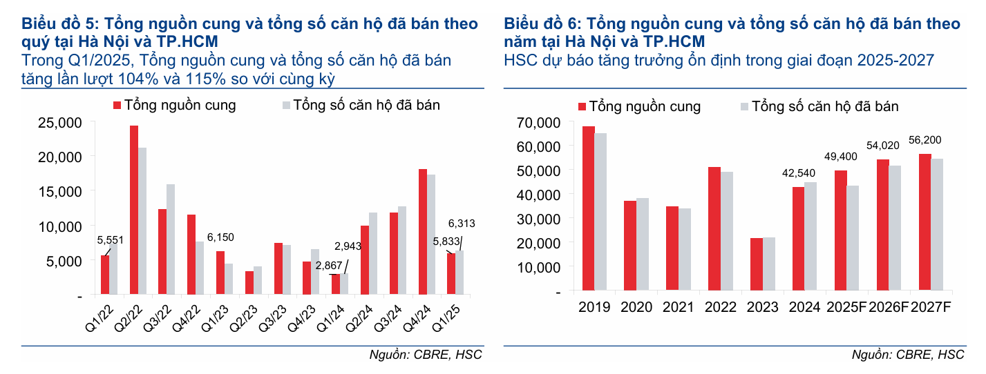 - Thị trường Bất động sản: Nguồn cung căn hộ tại Hà Nội và TP.HCM trong Q1/2025 tăng hơn gấp đôi (+104% YoY), và số lượng căn hộ bán ra vượt tổng nguồn cung (+115% YoY), cho thấy tâm lý thị trường đang cải thiện. CBRE dự báo tổng nguồn cung căn hộ tiếp tục tăng 16.1% trong 2025, 9,4% trong 2026 và 4% trong 2027.