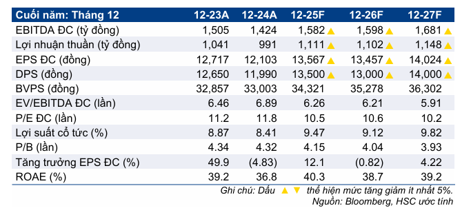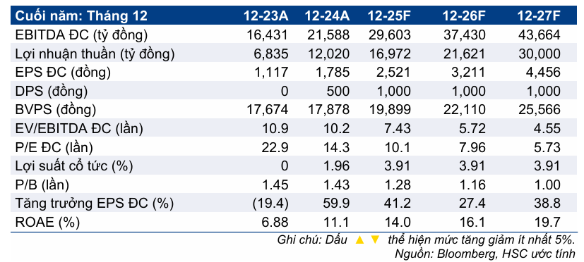 - HPG: HSC giữ nguyên dự báo lợi nhuận 2025-2027, với LN thuần dự kiến tăng trưởng CAGR 3 năm đạt 36%. Năm 2025, LN thuần dự báo tăng mạnh 41% đạt 17 nghìn tỷ đồng.