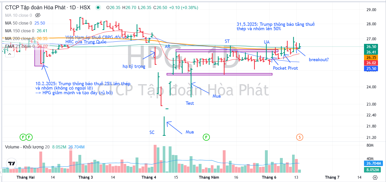- HPG (Mua vào; giá mục tiêu 36,500đ): Vẫn là lựa chọn hàng đầu của HSC, với tiềm năng tăng giá 43%. HPG đang giao dịch với P/E trượt dự phóng 1 năm là 9.1 lần, thấp hơn bình quân lịch sử (11.8 lần). Vị thế dẫn đầu, tập trung thị trường nội địa và kỳ vọng áp thuế CBPG vĩnh viễn đối với HRC Trung Quốc là các yếu tố hỗ trợ dài hạn.
