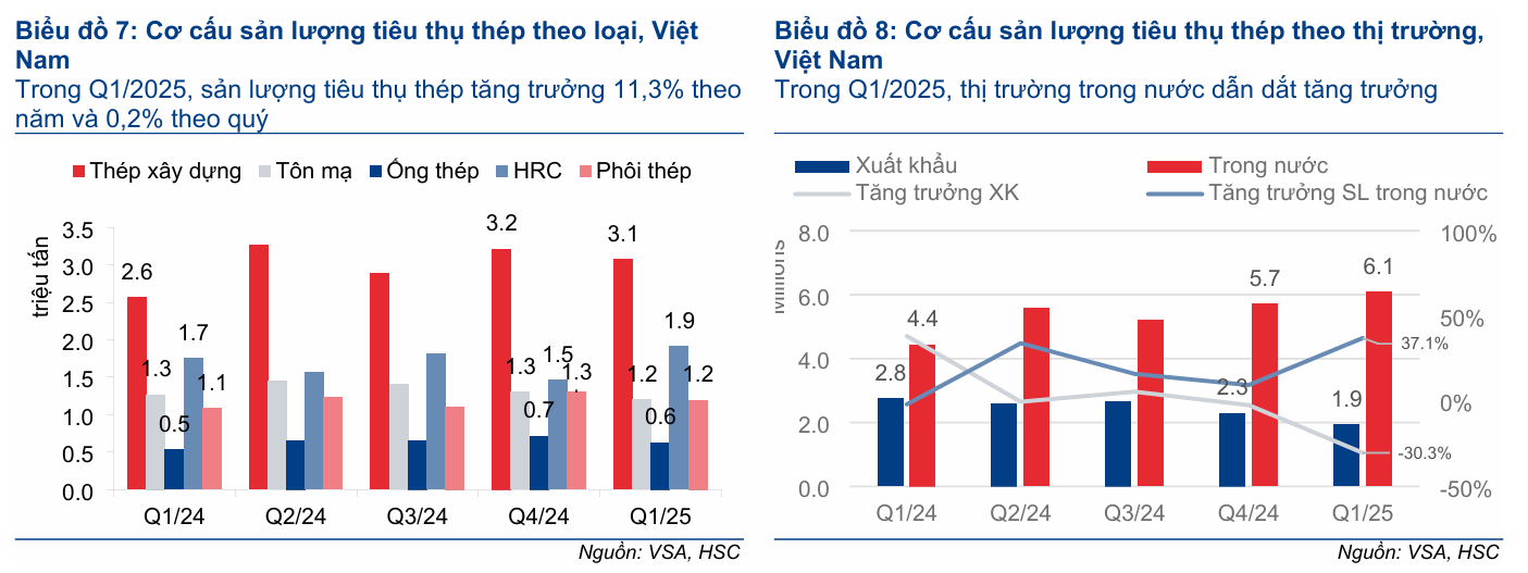 - HRC (Thép cuộn cán nóng): Sản lượng tiêu thụ Q1/2025 tăng 9.2% YoY (tiêu thụ trong nước tăng 71% YoY), hưởng lợi từ việc áp thuế CBPG tạm thời đối với HRC Trung Quốc (có hiệu lực từ 8/3/2025). HPG đã vượt FMS trở thành nhà sản xuất HRC lớn nhất Việt Nam, chiếm 52% thị phần.