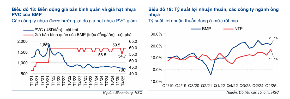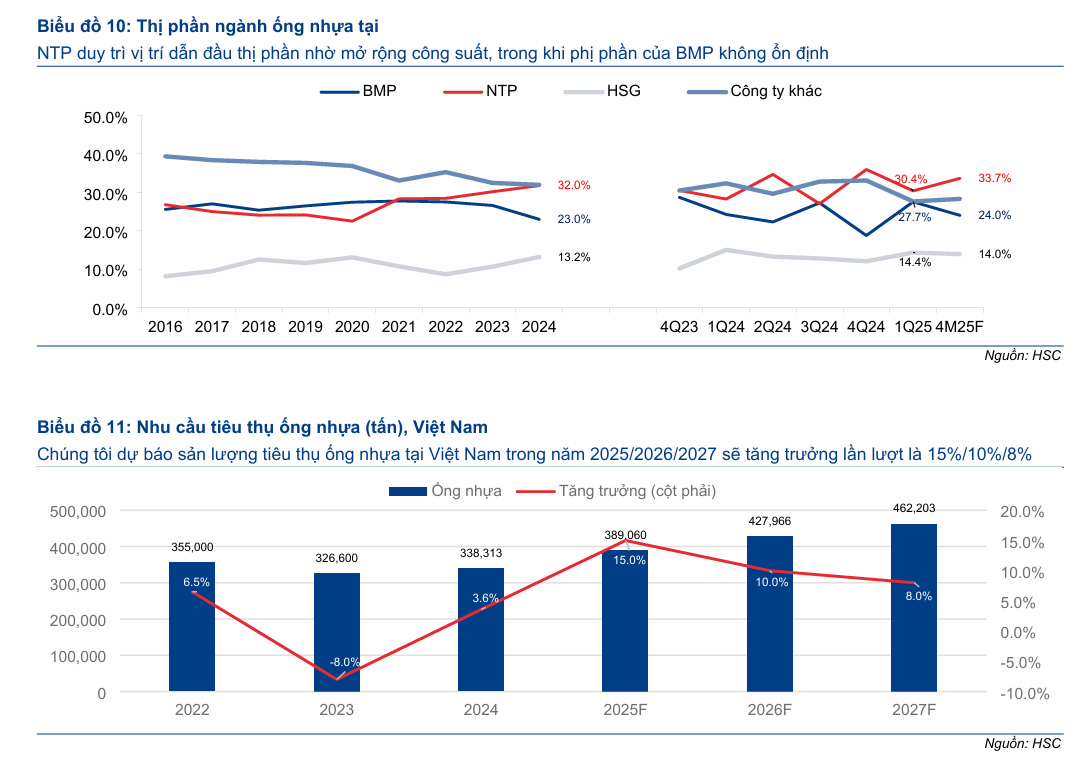- Ống nhựa: Nhu cầu trong nước tăng 21.7% so với cùng kỳ đạt 122,388 tấn trong 4 tháng đầu năm 2025, cũng nhờ đầu tư công và BĐS phục hồi. Chi phí hạt nhựa PVC đầu vào thấp tiếp tục hỗ trợ lợi nhuận. NTP và HSG đang mở rộng thị phần trong khi BMP có sự biến động.