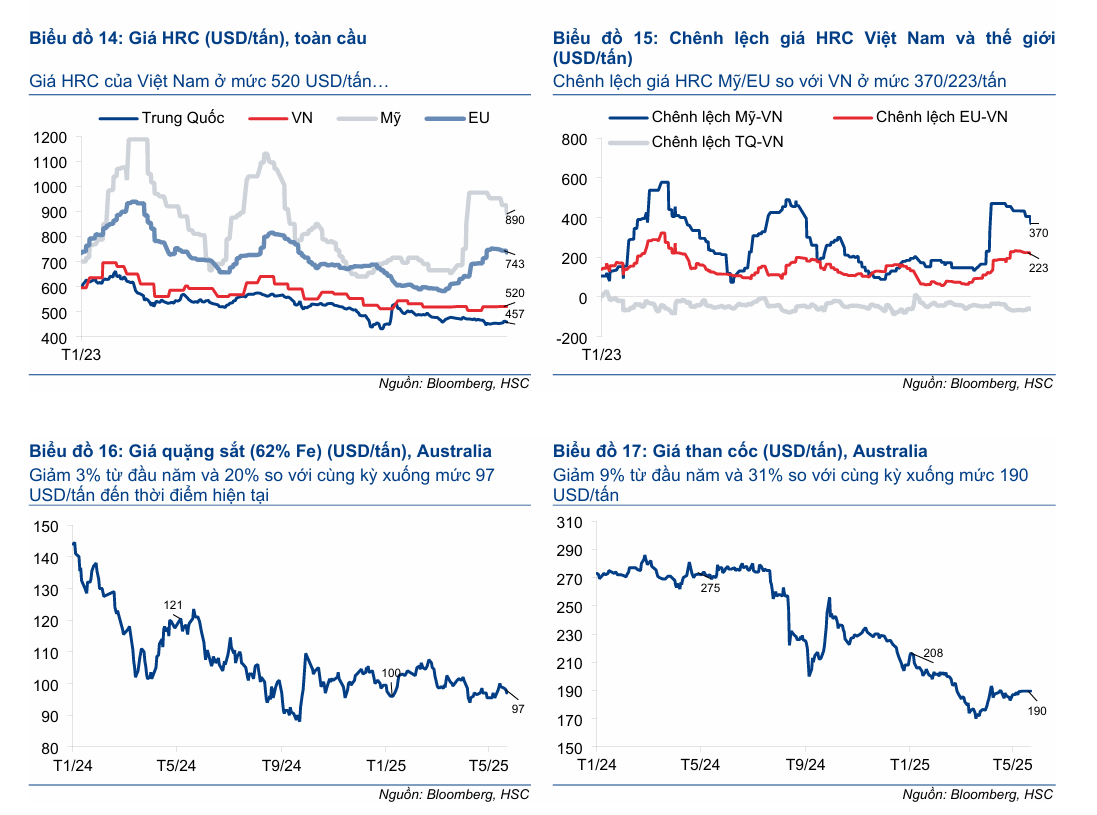 - Tôn mạ: Phân khúc kém tích cực nhất (-5.6% YoY) do xuất khẩu giảm mạnh 41.5% YoY (mất thị trường Mỹ và nhu cầu toàn cầu yếu), dù tiêu thụ trong nước tăng 57.2% YoY. HSG vẫn dẫn đầu thị phần (27.1%).