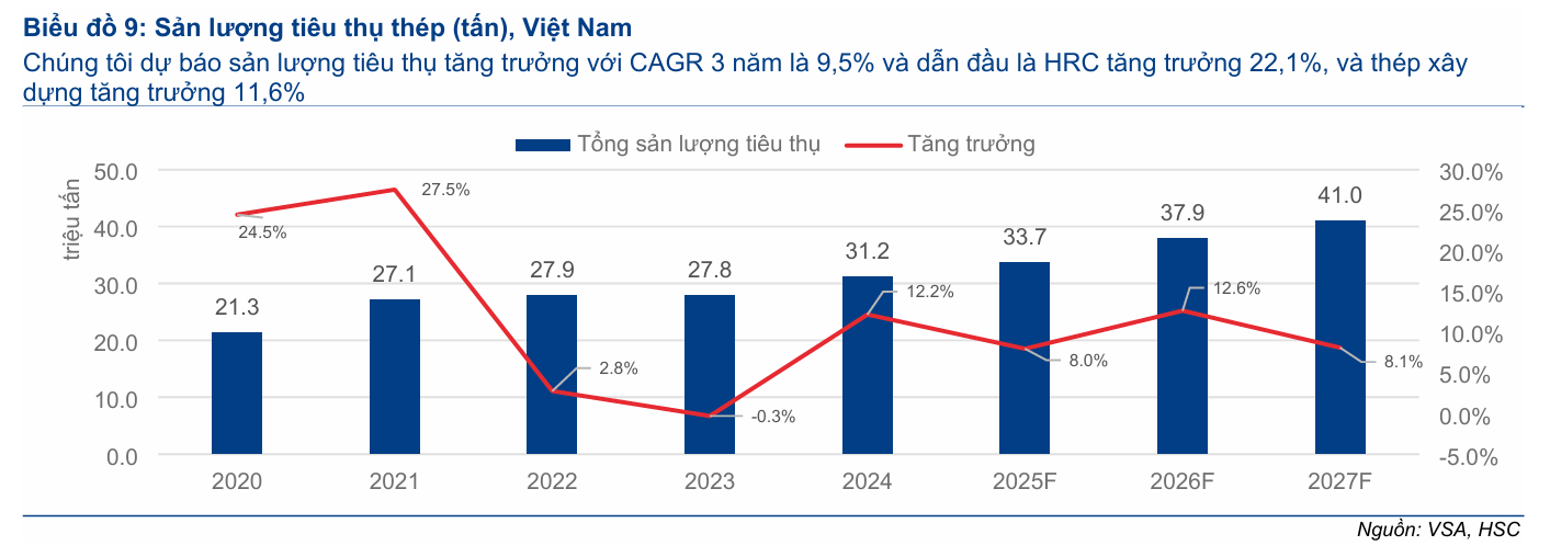HSC duy trì quan điểm tích cực đối với ngành VLXD, với HPG là lựa chọn hàng đầu (Elibook Team cũng chọn HPG và BMP). HSC dự báo sản lượng tiêu thụ thép/ống nhựa sẽ tăng trưởng với tốc độ CAGR 3 năm lần lượt ở mức 9.5%/11% trong giai đoạn 2025-2027. Cụ thể, nhu cầu thép 2025/2026/2027 dự kiến tăng 8%/12.6%/8.1%. Nhu cầu ống nhựa 2025 dự kiến tăng 15% YoY.