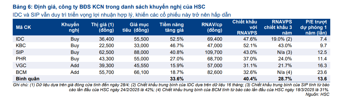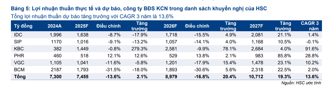 HSC, trong báo cáo ngành BĐS KCN (ngày 13.5.2025), đã điều chỉnh giảm 10-30% diện tích đất cho thuê và giảm 16-18% dự báo tổng lợi nhuận toàn ngành cho giai đoạn 2025-2026 do rủi ro từ chính sách thuế đối ứng, khiến nhà đầu tư có xu hướng “án binh bất động”. Tuy nhiên, HSC vẫn duy trì quan điểm lạc quan về dài hạn đối với ngành, cho rằng Việt Nam vẫn có lợi thế cạnh tranh trong việc thu hút FDI.