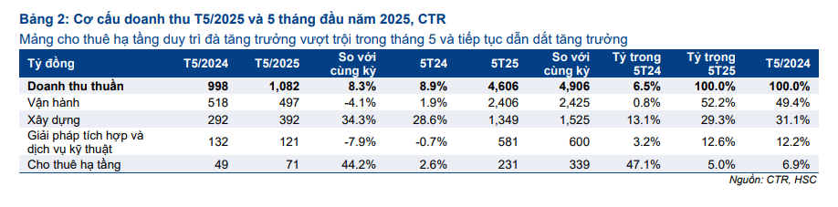 • Mảng cho thuê hạ tầng: Tăng 44.2% so với cùng kỳ, đạt 71 tỷ đồng. Lũy kế 5 tháng tăng 47%, đạt 339 tỷ đồng.