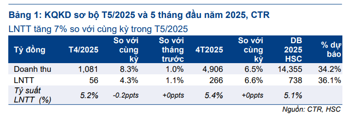 HSC (18.6.2025) duy trì khuyến nghị Mua vào và giữ nguyên giá mục tiêu 123,000đ (tiềm năng tăng giá 28%) đối với CTR. HSC lạc quan về kết quả kinh doanh 5 tháng đầu năm và kỳ vọng tiến độ lắp đặt trạm BTS sẽ tăng tốc trở lại.