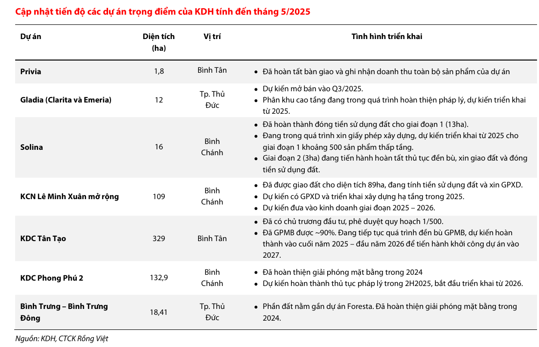- The Solina Giai đoạn 1 (Bình Chánh): KBSV và Vietcap kỳ vọng KDH sẽ mở bán dự án 13ha này (500 sản phẩm thấp tầng) vào năm 2026, đóng góp tích cực từ năm 2026 trở đi. Dự án đã nhận được giấy phép xây dựng hạ tầng và dự kiến triển khai trong năm 2025.