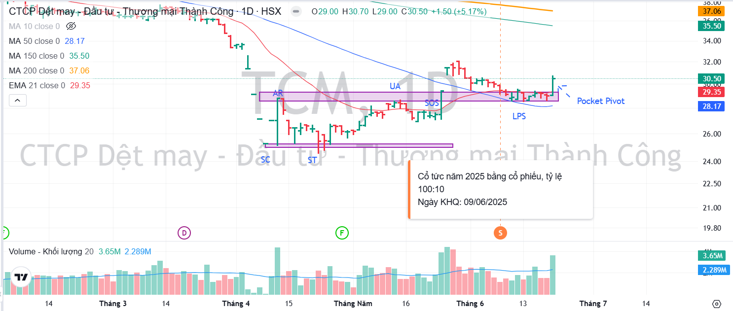 Ngày 20.6.2025, TCM có điểm mua Pocket Pivot. Các cổ phiếu dệt may trong ngành như MSH, TNG cũng có điểm mua tương tự.