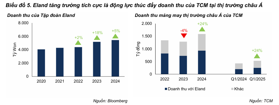 Công ty Cổ phần Dệt may – Đầu tư – Thương mại Thành Công (TCM) đang ở trong giai đoạn chuyển mình với những động lực tăng trưởng mới từ thị trường châu Á, trong khi vẫn đối mặt với các thách thức từ thị trường truyền thống như Mỹ. FTPS cho rằng, doanh thu mảng may sang Châu Á năm 2025 ước đạt 1,729 tỷ đồng (+9% YoY), chủ yếu nhờ khách hàng lớn Eland liên tục gia tăng đơn hàng (dự phóng doanh thu từ Eland đạt 1,043 tỷ đồng, +12% YoY), cùng với nhu cầu nhập khẩu tại Nhật Bản phục hồi và lợi thế chi phí lao động của Việt Nam so với Trung Quốc.