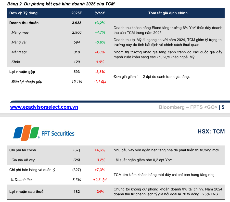 • Rủi ro đầu tư: FPTS nhấn mạnh rủi ro từ thuế quan tại Mỹ (có thể áp thuế 46%) ảnh hưởng tiêu cực đến TCM, và tình hình kinh doanh của khách hàng lớn Eland.