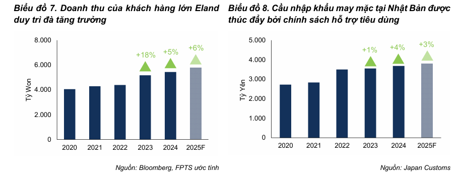 • Thị trường Châu Á là động lực chính: Doanh thu mảng may sang Châu Á ước đạt 1,729 tỷ đồng (+9% YoY), chủ yếu nhờ khách hàng lớn Eland liên tục gia tăng đơn hàng (dự phóng doanh thu từ Eland đạt 1,043 tỷ đồng, +12% YoY), cùng với nhu cầu nhập khẩu tại Nhật Bản phục hồi và lợi thế chi phí lao động của Việt Nam so với Trung Quốc.