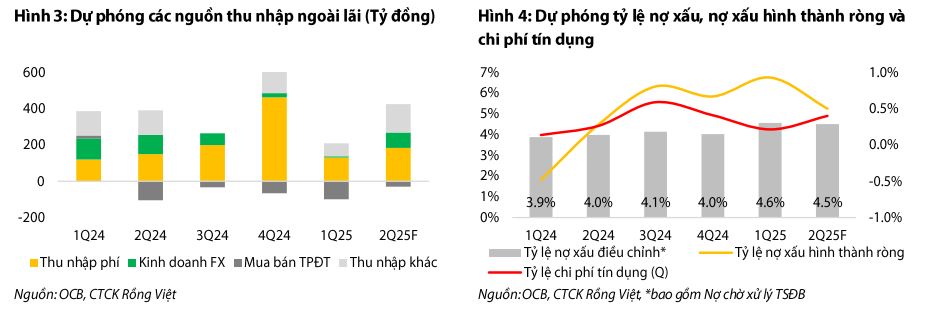 VDSC dự phóng lợi nhuận trước thuế (LNTT) Quý 2/2025 của OCB đạt 990 tỷ đồng (+11% QoQ và +10% YoY) và NIM cải thiện 5bps QoQ lên 3.2%. Thu nhập ngoài lãi mở rộng ở mức nền thấp của quý trước (+260% QoQ và +38% YoY). Chi phí trích lập dự phòng được dự báo tăng mạnh (+94% QoQ và 75% YoY), tương ứng tỷ lệ chi phí tín dụng 0.4% (Quý 1/2024: 0.2%).