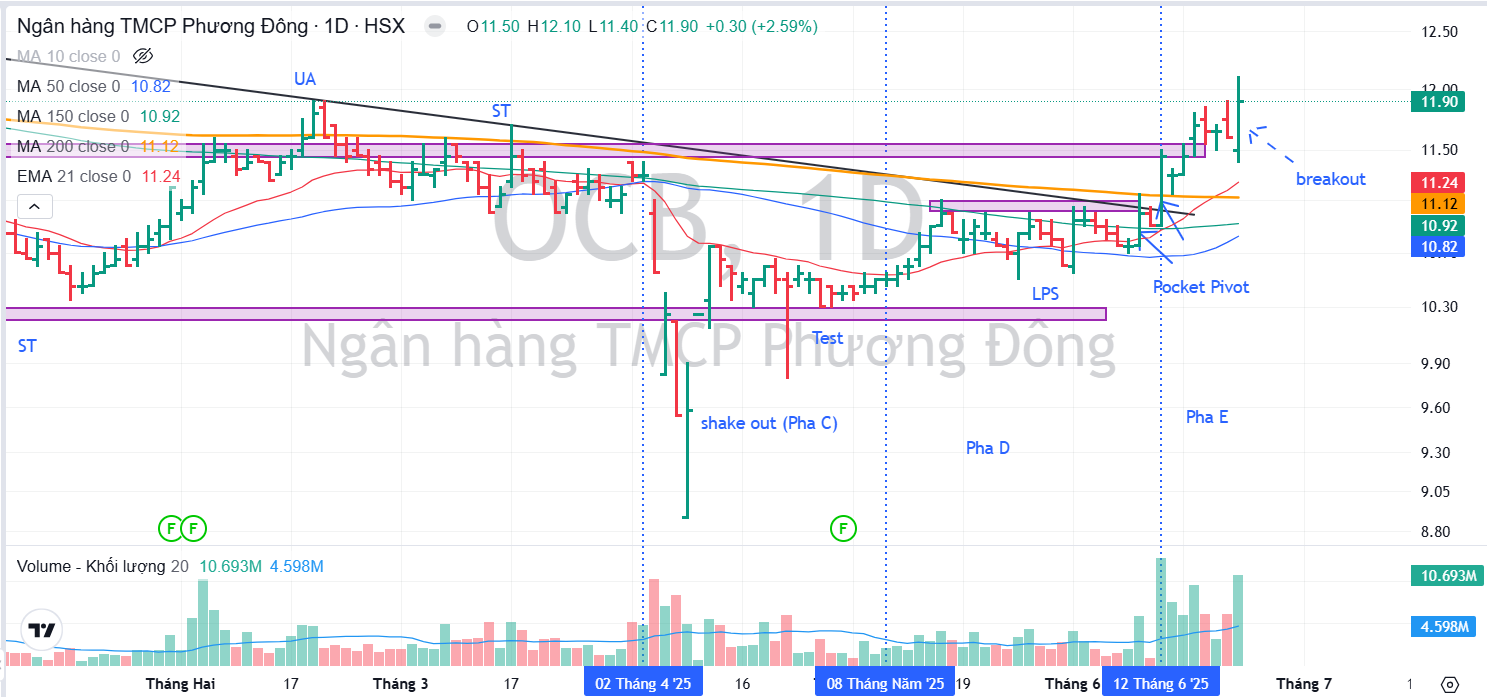 Ngày 23.6.2025, OCB breakout thoát ra khỏi vùng tích luỹ và bước vào pha E tăng giá.