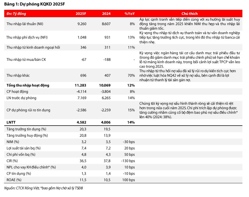 - Chất lượng tài sản: Tỷ lệ nợ xấu trên tổng dư nợ dự kiến tăng lên 2.45% (từ 2.41% cuối năm 2024).