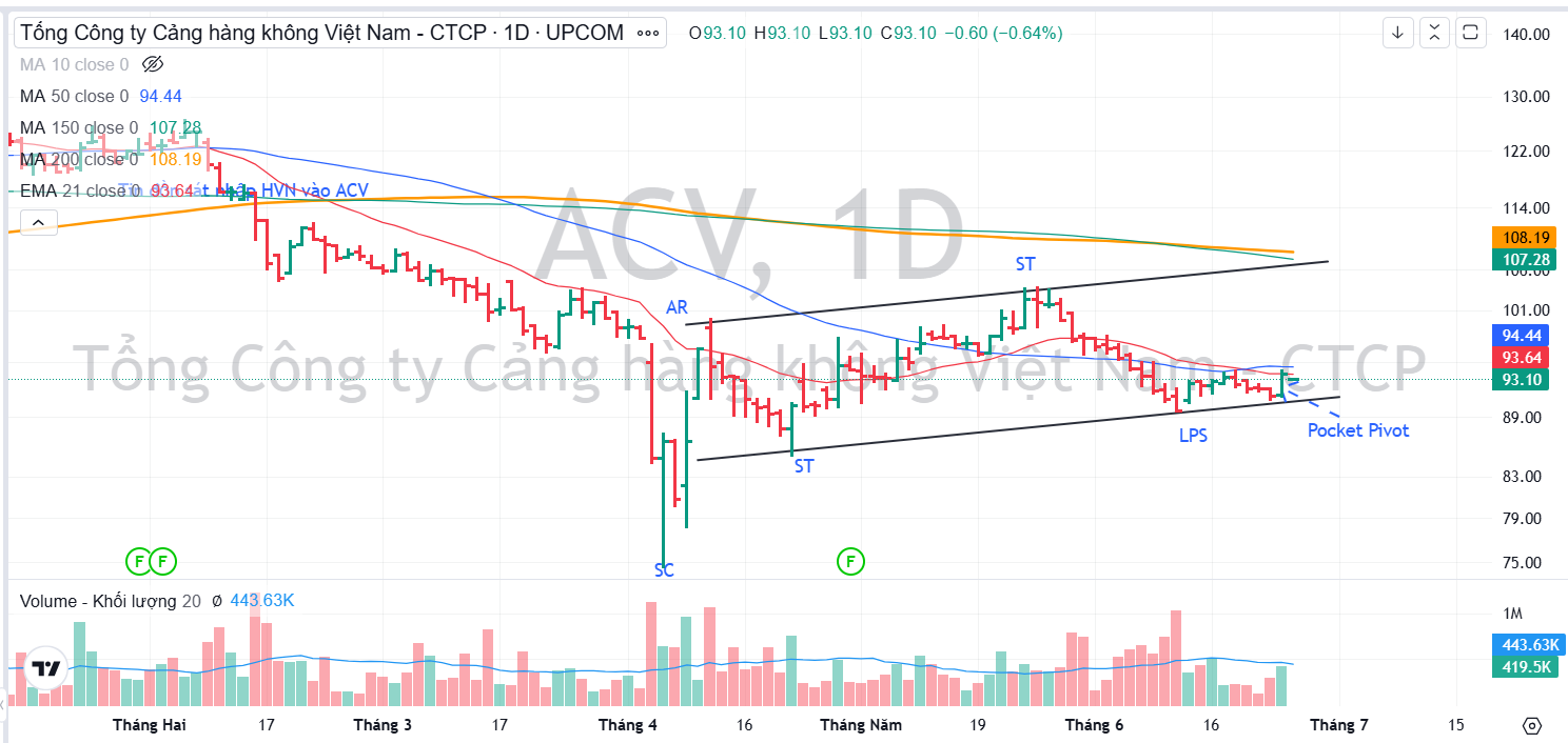 Ngày 24.6.2025, HVN có điểm mua Pocket Pivot sớm khi giá tìm về kênh hỗ trợ bên dưới.