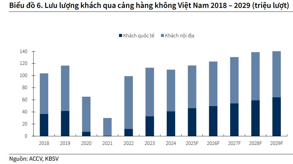 KBSV (13.6.2025) đưa ra khuyến nghị MUA đối với cổ phiếu ACV với giá mục tiêu 109,500 VND/cổ phiếu, dựa trên giả định thận trọng về tăng trưởng khách (khách quốc tế 12% năm 2025, 8-9%/năm 2026-2030; khách nội địa 3-4%/năm).