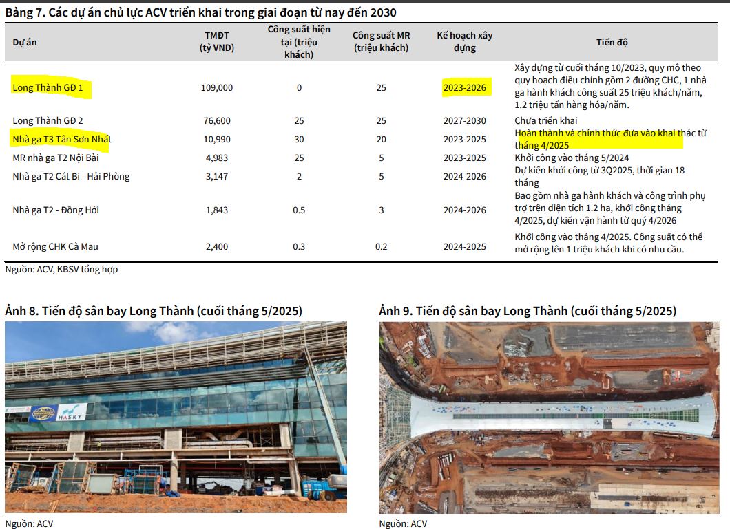 - Tiến độ dự án: Nhà ga T3 Tân Sơn Nhất đã hoàn thành và đi vào hoạt động từ tháng 4/2025. Cảng HKQT Long Thành đang được đẩy nhanh tiến độ, dự kiến khai thác từ năm 2026. Ngoài ra, ACV đã khởi công nhiều dự án mở rộng tại Cát Bi, Đồng Hới, Cà Mau trong Quý 2/2025, đảm bảo bổ sung công suất liên tục. Tổng công suất của ACV dự kiến tăng 17%/18% YoY sau khi T3 và Long Thành đi vào vận hành.