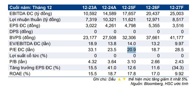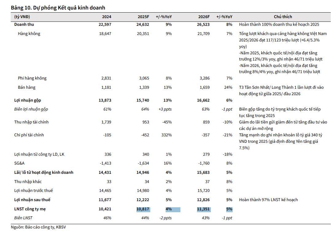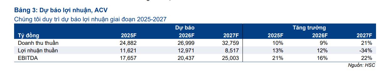 HSC giữ nguyên dự báo lợi nhuận giai đoạn 2025-2027. Lợi nhuận thuần dự báo tăng 13% (11,600 tỷ VND) trong năm 2025 và 12% (13 nghìn tỷ VND) trong năm 2026. Tuy nhiên, lợi nhuận thuần dự báo giảm 34% trong năm 2027 do chi phí khấu hao và lãi vay tăng trong giai đoạn đầu vận hành Cảng hàng không quốc tế Long Thành (LTIA). Dù vậy, EBITDA dự báo vẫn tăng trưởng mạnh mẽ với CAGR 3 năm đạt 20%.